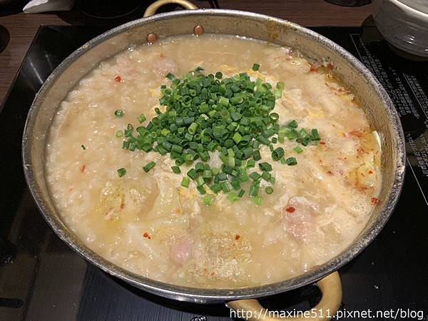 把料吃得差不多之後,留一點肥腸跟青菜在鍋裡,就可以請服務員把鍋子收走,拿回廚房煮粥了唷!もつ鍋送回來之後就會像上面的圖一樣,把蔥花放在正中間。