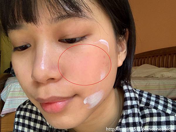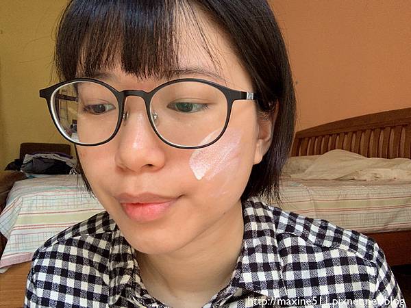 原諒一下我的背景,因為我的房間照不到陽光,只好跑到家人的房間來拍 (淚)。跟塗在手上一樣,雖然是主打輕爽不黏膩,但是因為金靚白水亮防曬乳是乳液狀的質地,所以擦在臉上不會像他牌防曬很水一直往下掉,而且用手或海綿推開都很順,不會有悶悶的包覆感,也不會咬皮膚。