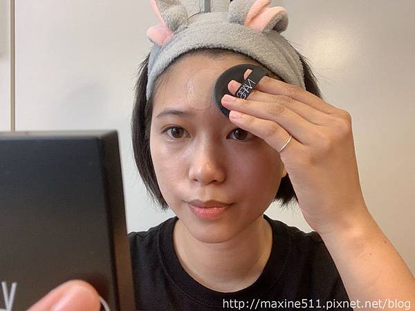這款氣墊粉餅的質地非常輕透好推開,我建議乾肌的朋友上一層就好,再使用遮瑕膏小範圍的重點遮瑕效果就很好。