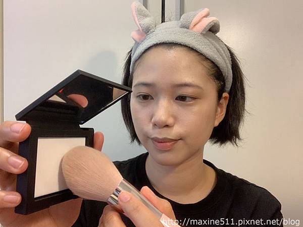 再來使用裸光蜜粉餅定妝,摸到NARS裸光蜜粉餅實體後被驚豔到,第一次遇到壓得這麼實的蜜粉餅,然後粉體非常非常細。我的蜜粉刷有一點太大,我會建議用小一點的刷子來回多刷幾次,確實沾上蜜粉後再到臉上輕拍定妝。