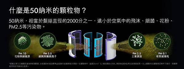 Dyson的HEPA濾網可以捕捉99.95%小至PM0.1的微粒污染物。