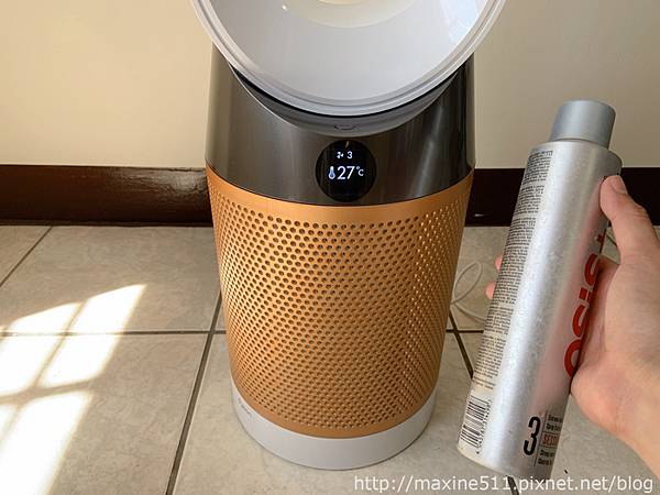 實際拿頭髮造型噴霧測試看看,對著TP06前方噴,LCD螢幕的數值直接爆掉變成紅色,再過一下下就可以看到數值慢慢往下,代表現在TP06正在消除環境中的汙染源。