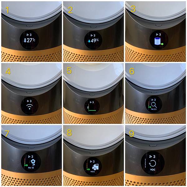 資訊功能表 (LCD螢幕) 可以了解透過Dyson TP06監測空氣品質後的數據,可以分別得知: