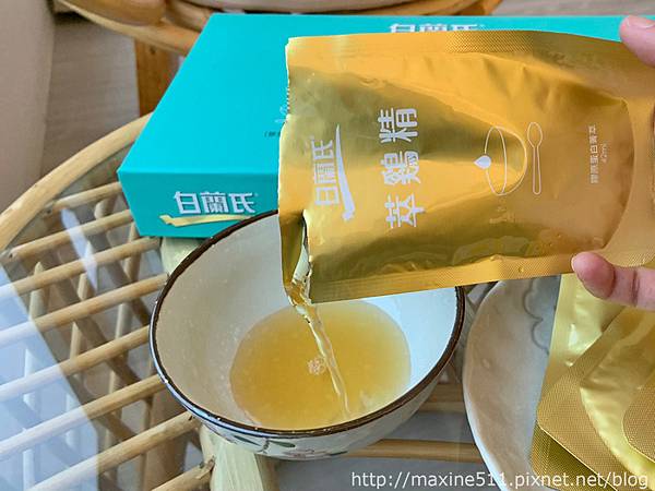 白蘭氏萃鷄精萃取高含量膠原蛋白,因此有一點點黏稠感,倒入碗中可以發現質地黏稠扎實,真的是滿滿的營養精華,但完全不會影響口感。