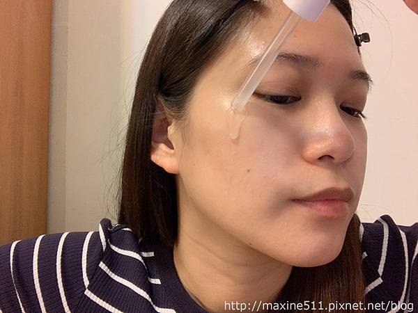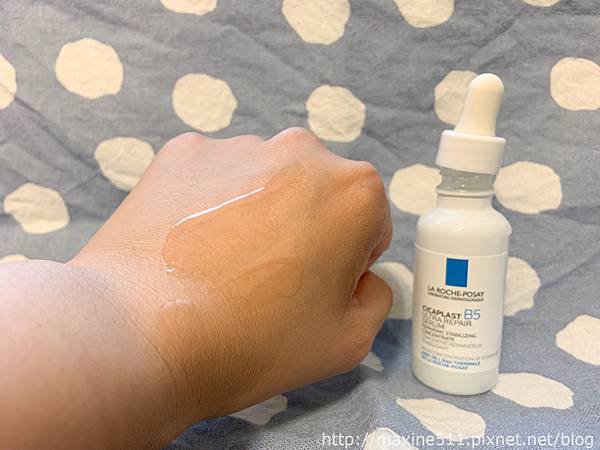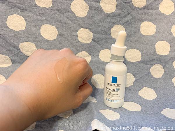 B5繃帶精華的每日早晚清潔與使用化妝水後,取適量塗抹於臉部及頸部,使用時取2-3滴在手掌心或是跟我一樣直接滴在臉上後推開。
