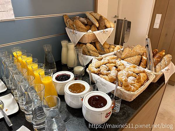 民宿的早餐菜色全部都擺在一個檯面上,有多款麵包搭配果醬。