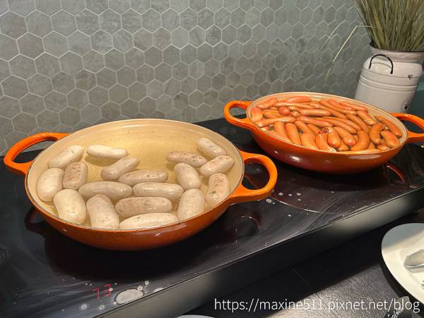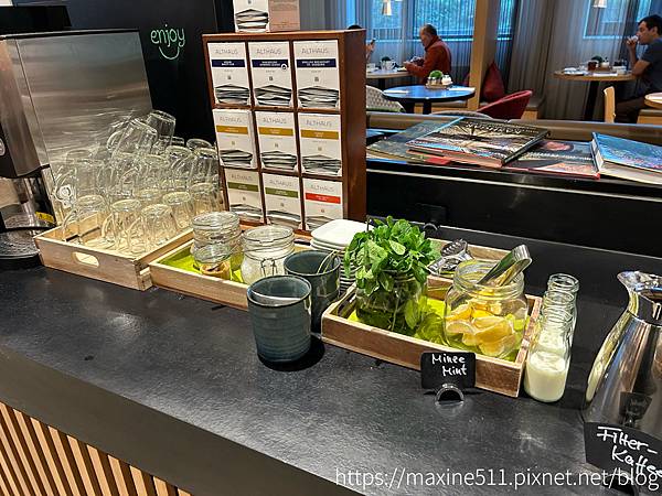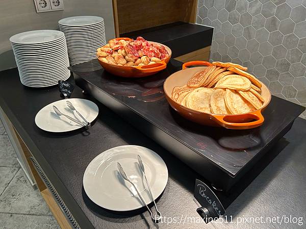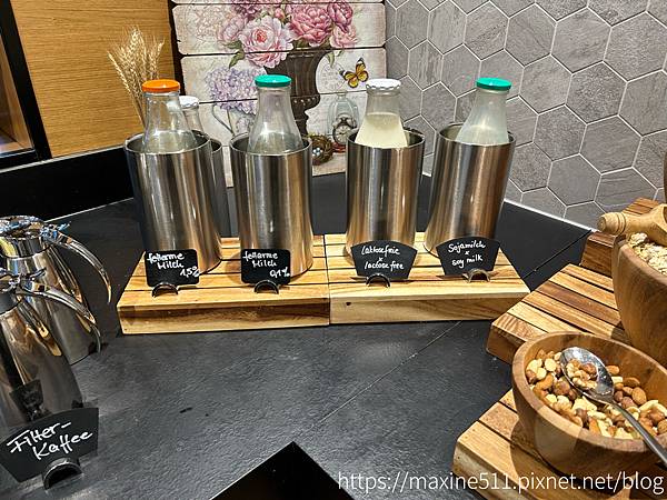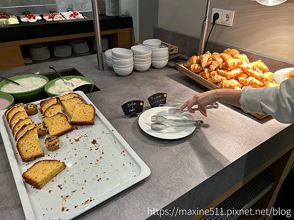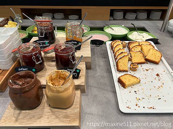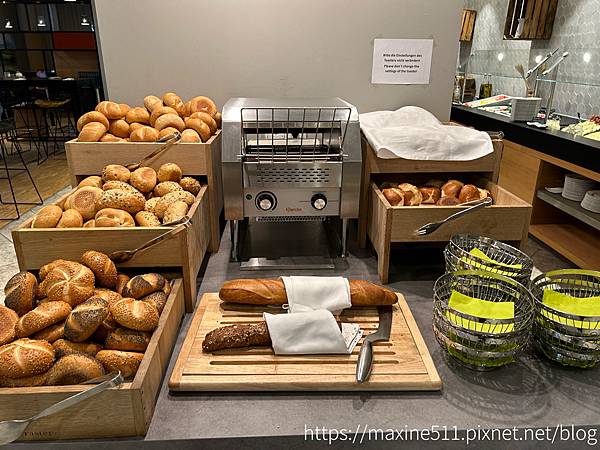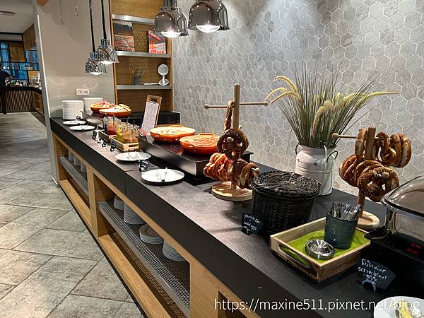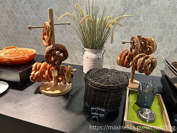 一進到早餐餐廳入口是熱食區,看到滿滿的pretzel。歐洲的水煮蛋習慣放在竹籃裡面,如果找不到蛋的話可以看一下是不是有竹籃在桌上,因為在台灣好像都是放在保溫盒比較多。