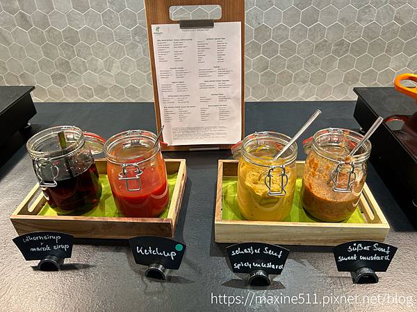 這裡有搭配香腸的醬料,後面的紙是早餐的菜色menu,那個時候沒有注意到這張,整理照片的時候才發現原來是menu阿~