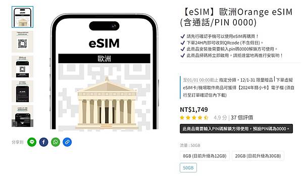 我的方案→ 【eSIM】歐洲Orange eSIM (含通話/PIN 0000) 28日 50GB