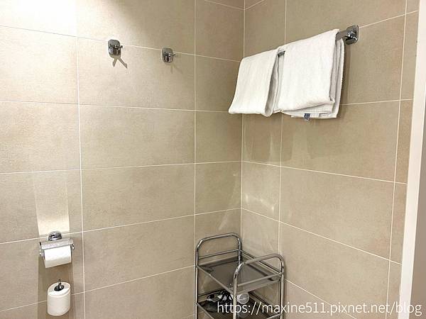我的天浴室超級寬敞的,難得看到浴缸,洗手台上有一個小檯面可以把所有的盥洗用具都放在上面,可以直接把盥洗包跟化妝包放廁所了,不用一直拿進拿出。