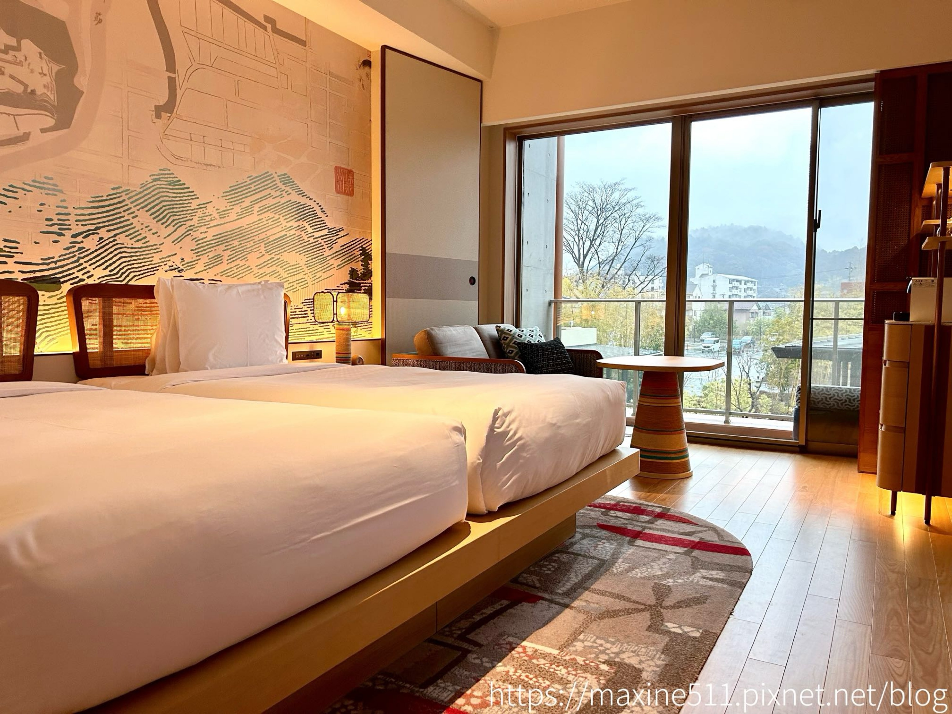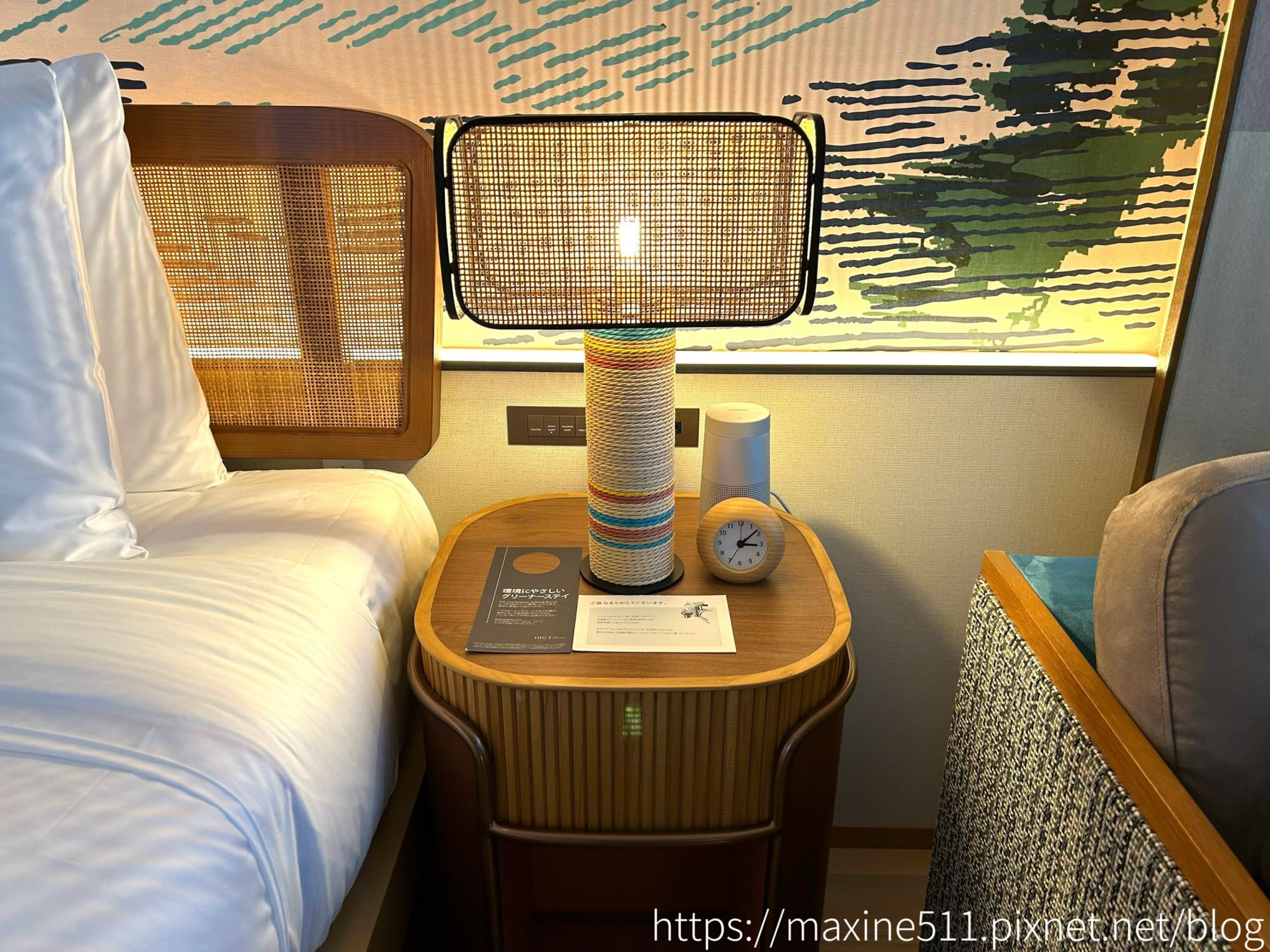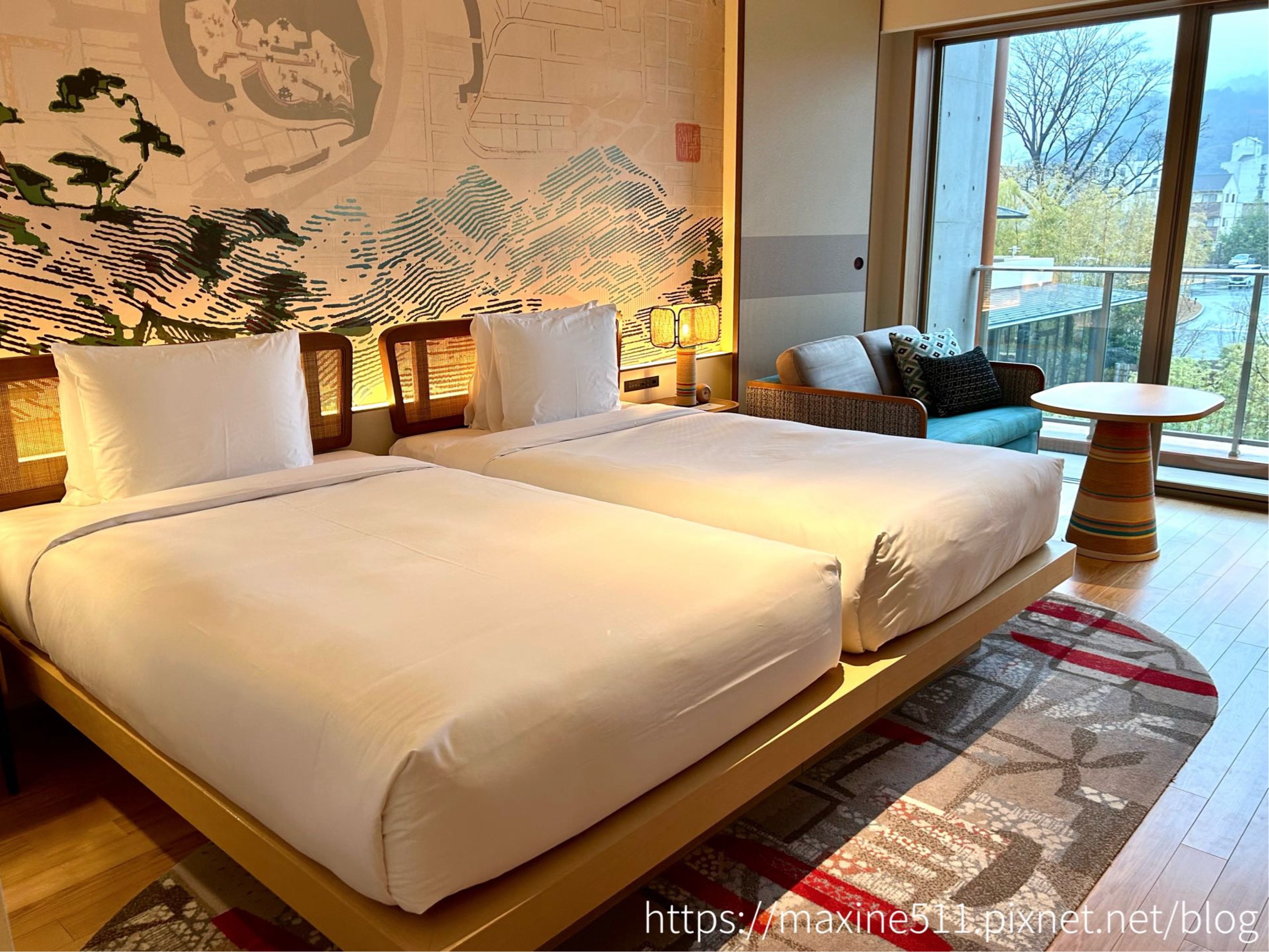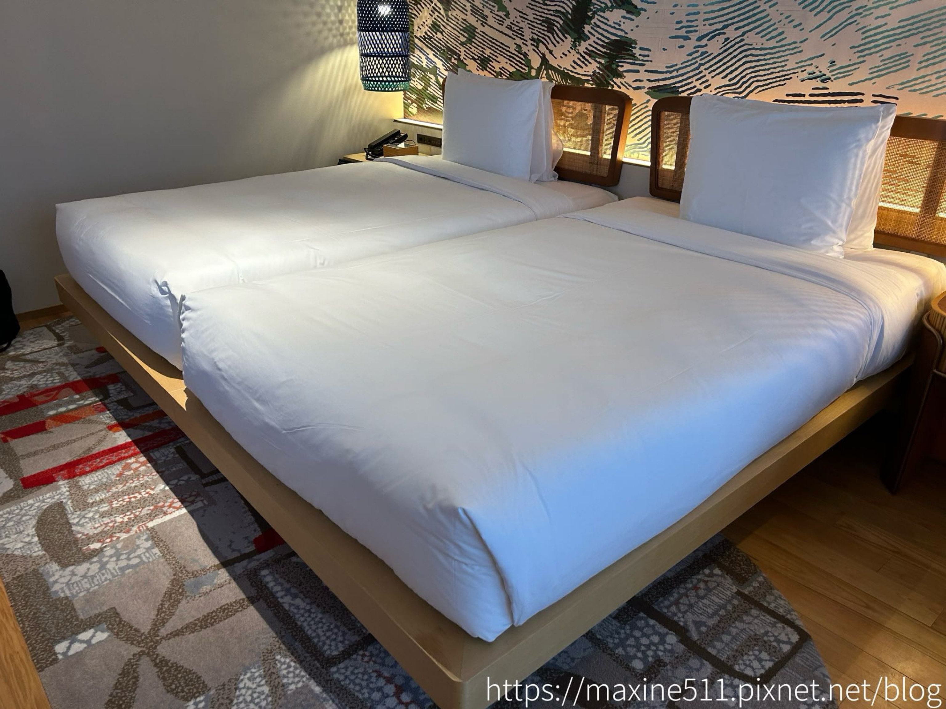 走進房間之後覺得房間燈光明亮,開心開心,我喜歡光線充足的飯店。走進一看發現是用兩個單人的床墊放在一個雙人床架上,這樣的設計也不錯,房務人員打掃起來應該也比較輕鬆,不用移來移去。 床墊因為比較厚支撐力很夠,睡起來真的很舒服。