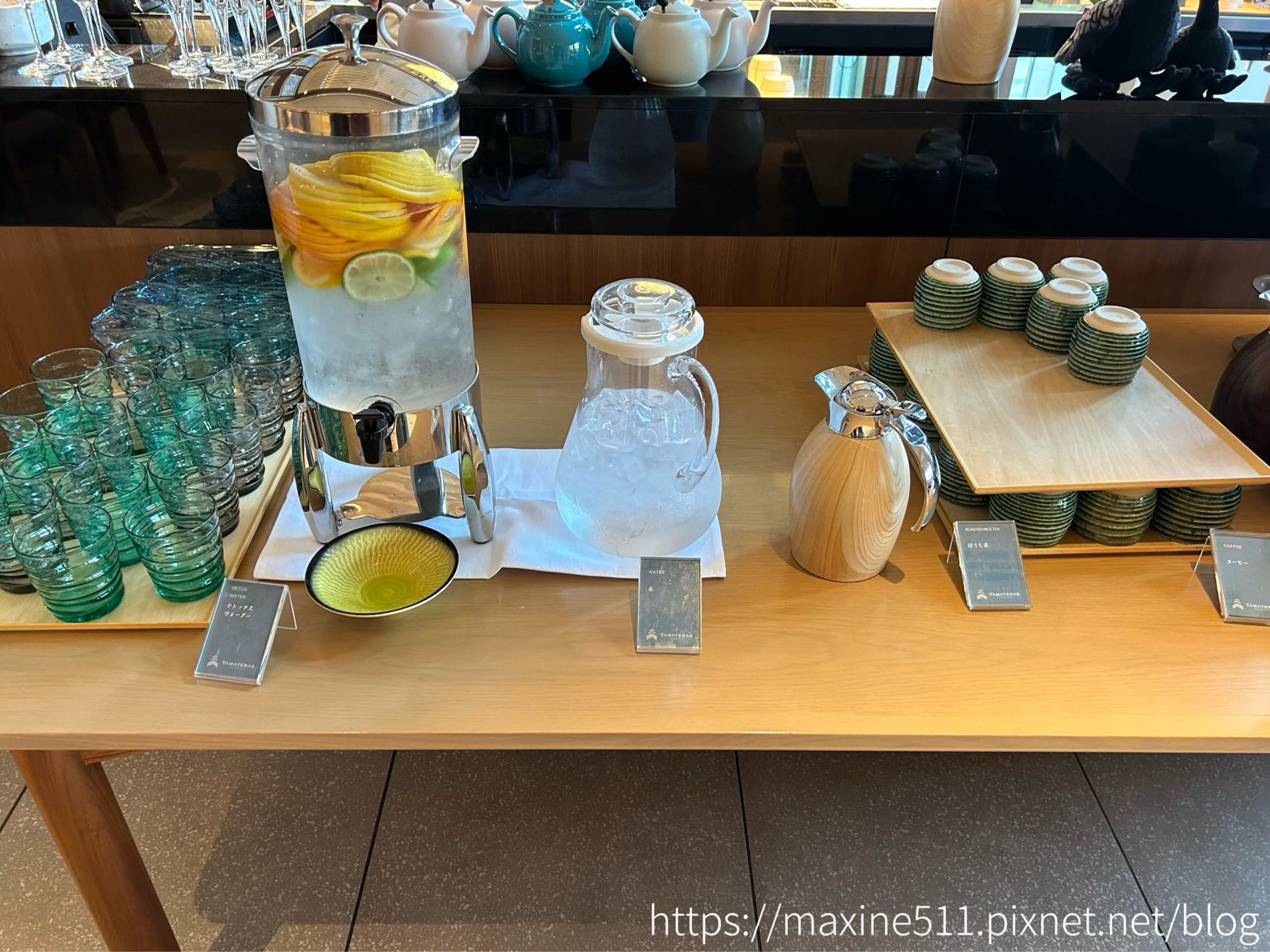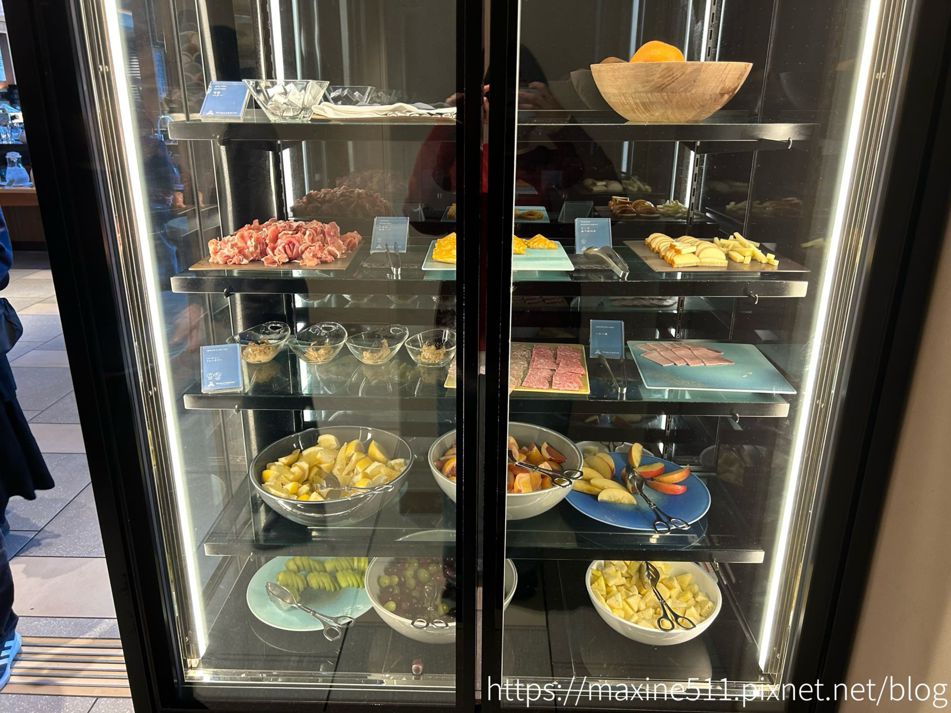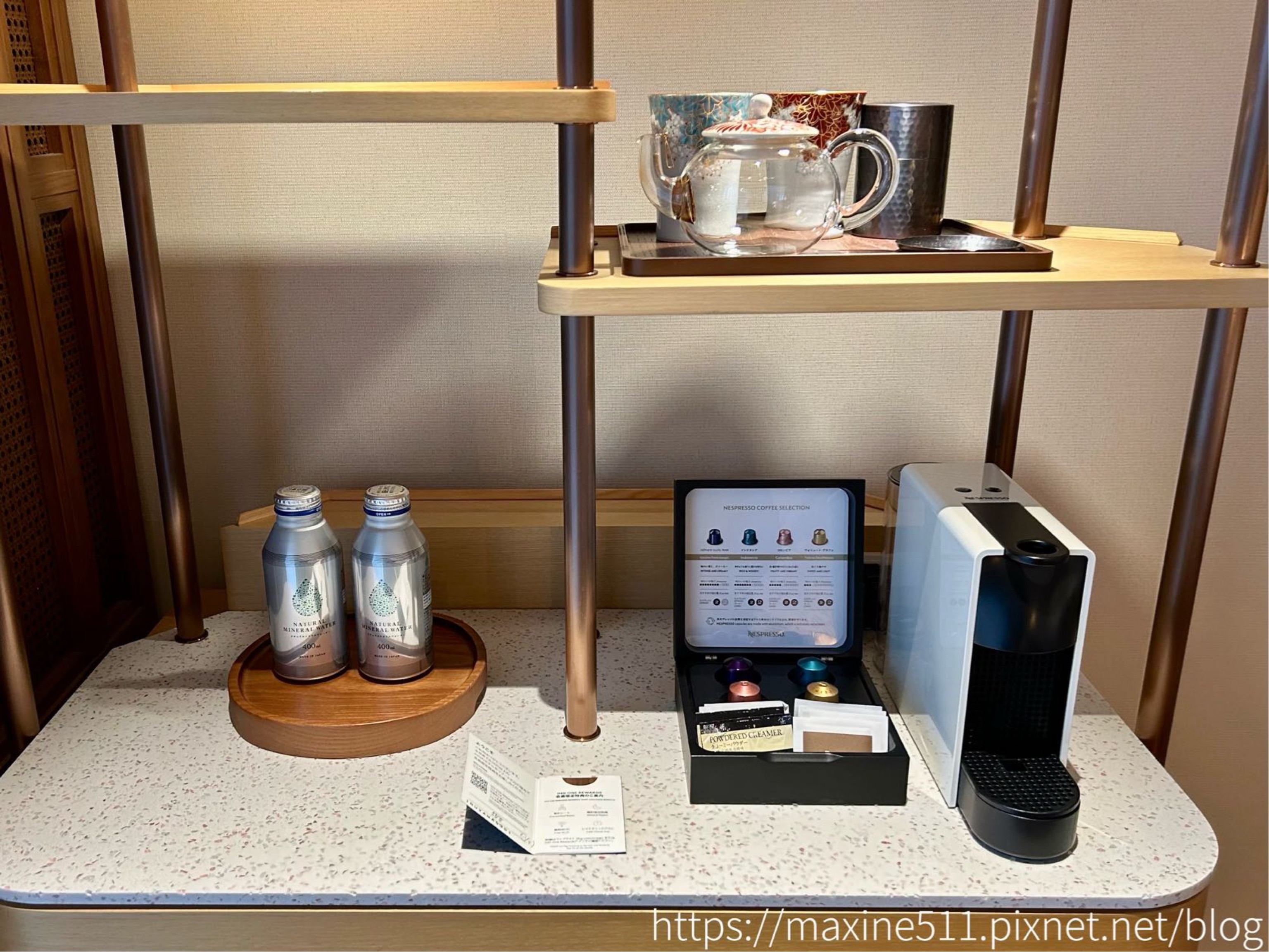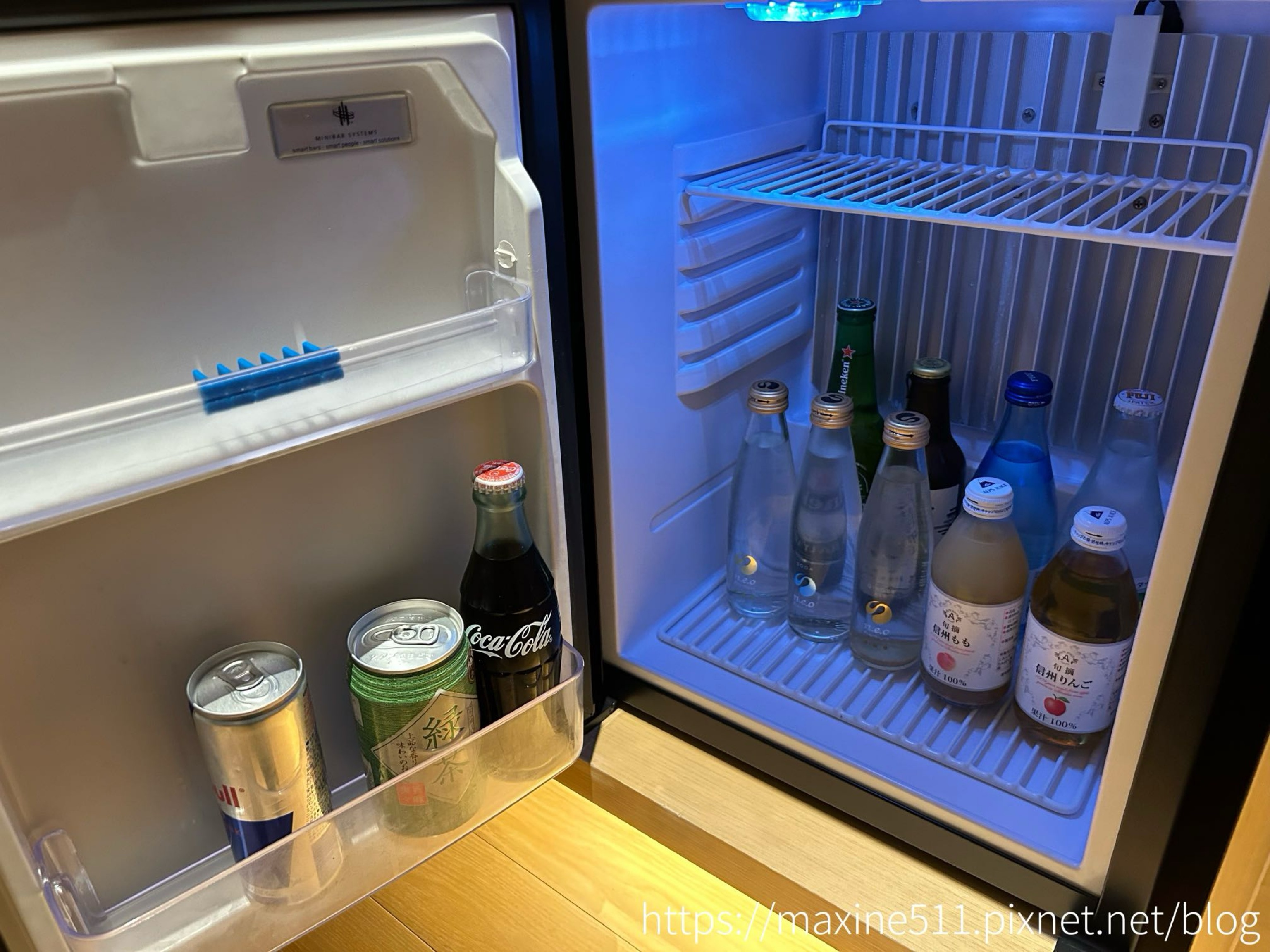 飲品的部分,飯店有提供瓶裝氣泡水,膠囊咖啡機,上面還有一個茶壺可以泡茶,鐵罐裡面則是茶包。冰箱裡面的飲料很多,不過是要付錢,如果真的很想喝冰飲可以到飯店大廳去拿冰水,但是晚上的時候好像會收起來。