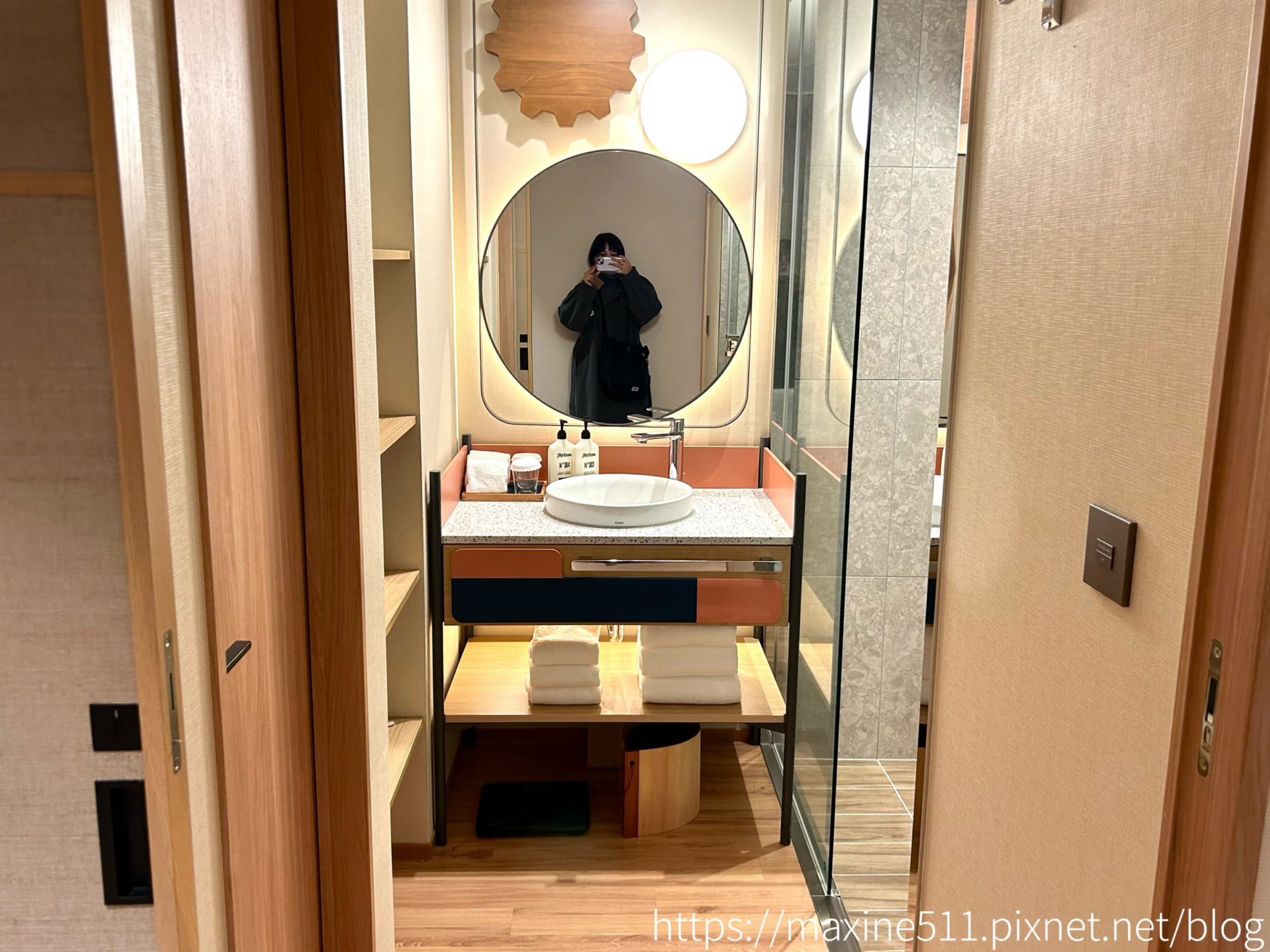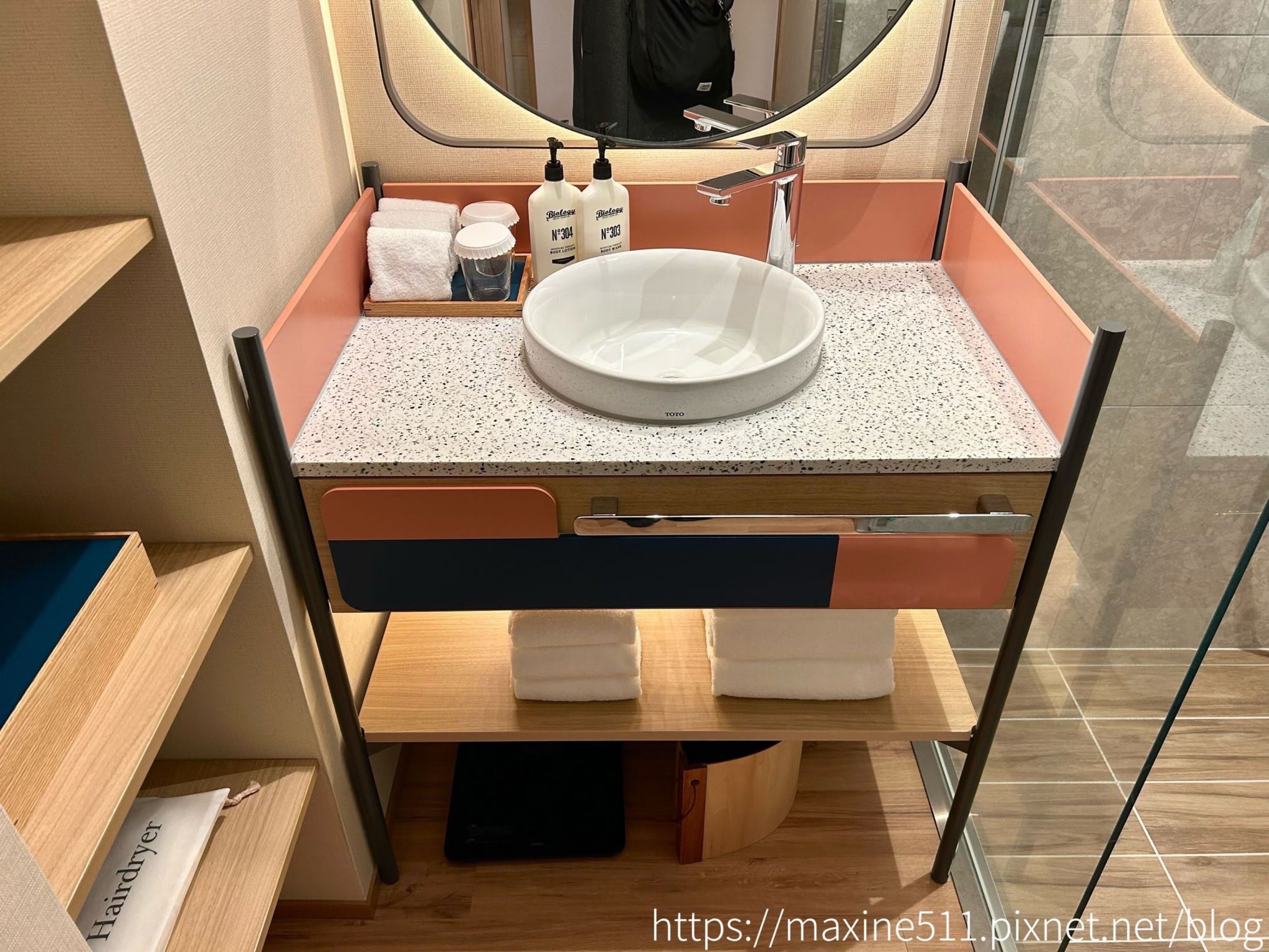 再來看一下浴室的部分,這個洗手台我太滿意了,光線充足很適合化妝,左邊還有櫃子可以放個人用品,洗手台檯面寬敞,不用擔心水會滴到地上。
