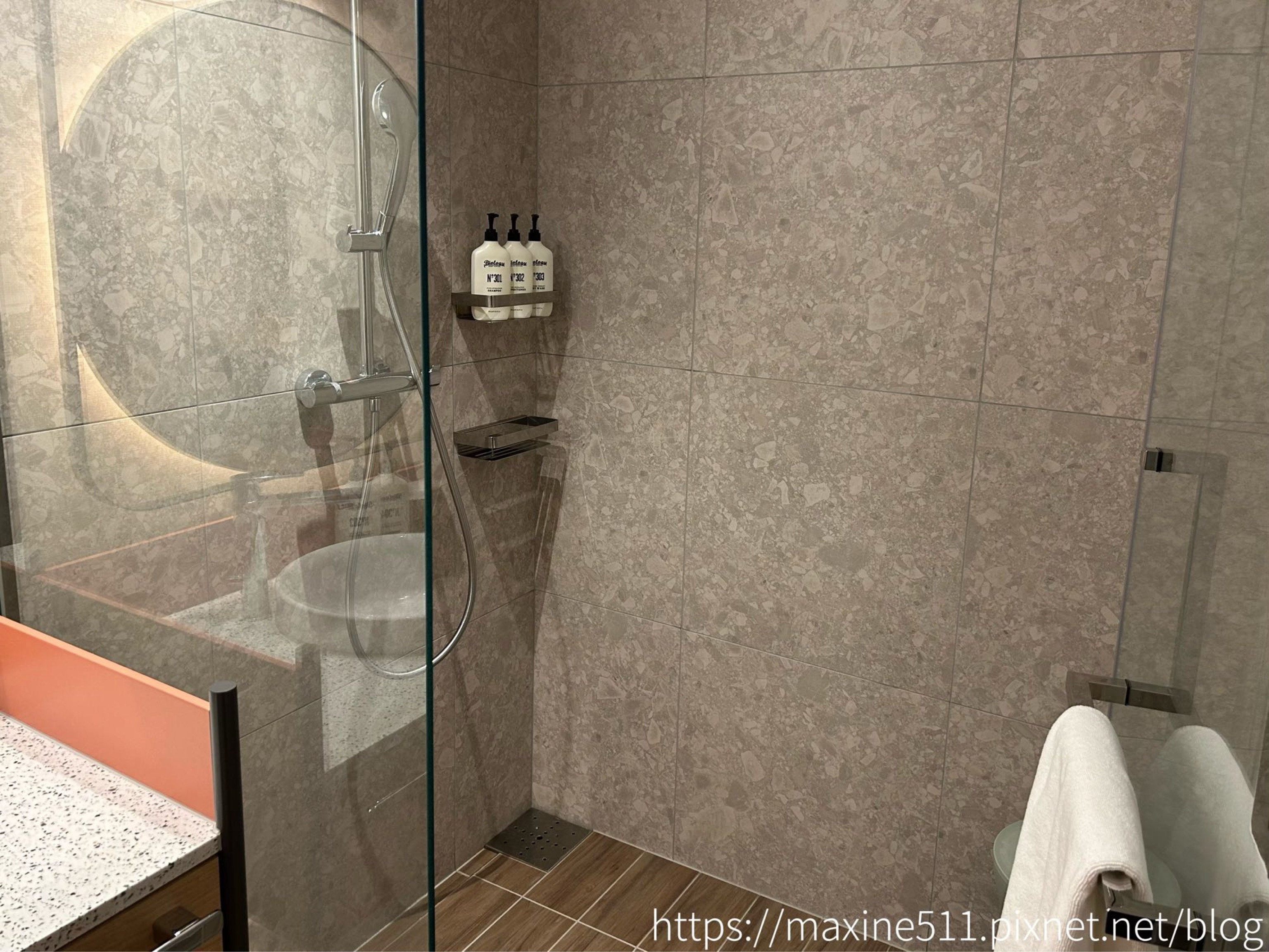右邊是淋浴間,左邊是馬桶。雖然淋浴間是透明玻璃,不過浴室門口還有一道門,洗澡的時候可以關起來。