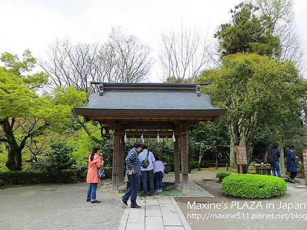 袈裟紋水磐-長壽之水。看介紹水前寺成趣的水池是引進阿蘇山的伏流水,而這個長壽之水的湧泉也是。從以前開始傳言長壽之水除了可以治病,喝了還能長命百歲呢! 喝法:拿勺子舀水將手沖一下後,再把勺子裡的水倒入手中,喝手裡的水。不要直接將勺子對著嘴巴喝唷! 喝完後,將勺子放回竹架上瀝乾 (如上圖)。