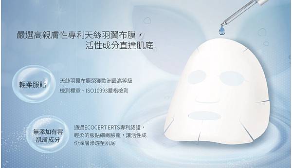 採用天然素材製成的優質隱形面膜,質地薄而輕透貼膚性極佳,觸感細緻,能將精華液有效滲入肌膚 。