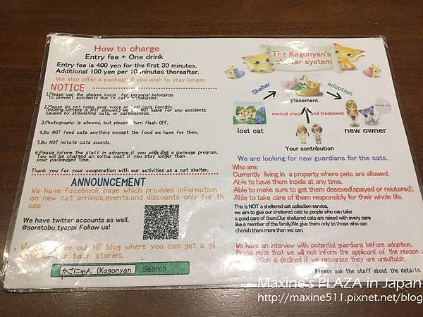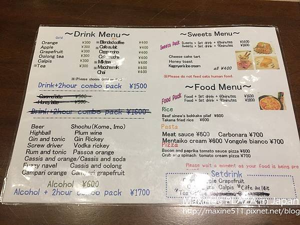 店員簡單講解消費方式,說明注意事項,就讓我們跟貓咪玩了。基本上就是點ㄧ杯飲料當低消,可以待30分鐘,如果要在加時間每10分鐘加100日圓。