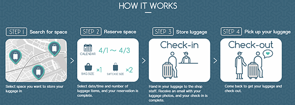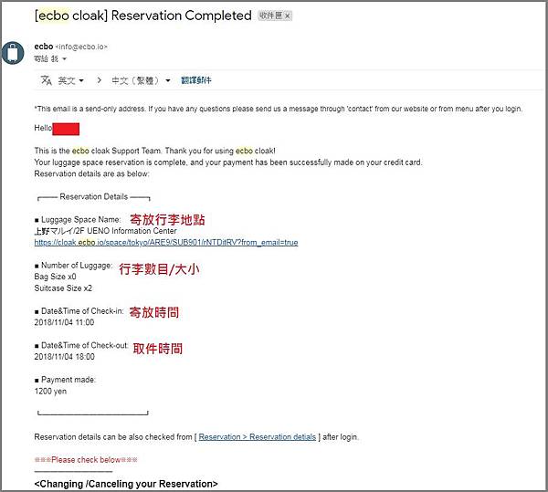 其中要特別注意,有些店家是不提供隔夜寄物,一定要當天寄放領取。確定預定寄放行李後,會先扣款,信箱會收到確認信。