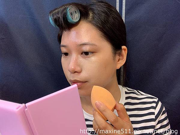 上妝時我會把粉底液擠在手上後,用手指沾取均勻點在臉上,由於這一款粉底液比較容易變乾,所以我會建議小範圍的慢慢上妝,這樣用美妝蛋或刷具推開時才不會卡卡。