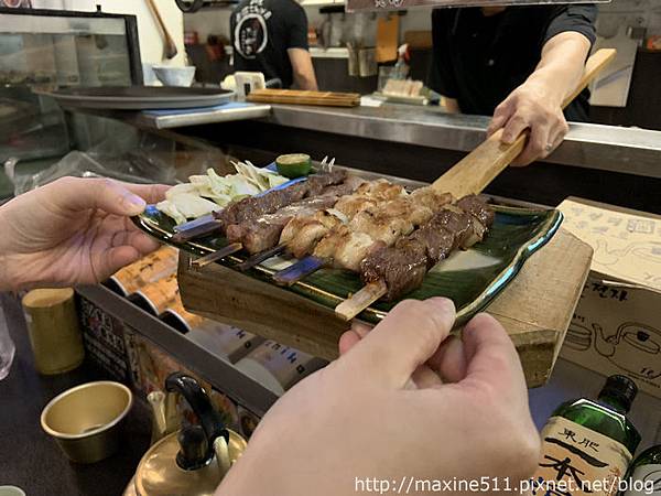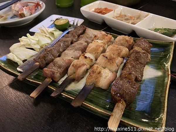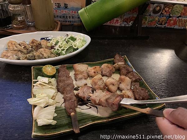 從右到左為牛肉、雞肉、雞肉、豬肉、豬嘴邊肉。盤子旁邊還很貼心的附上可以將肉從竹籤上分離的工具,不愧是日式居酒屋。
