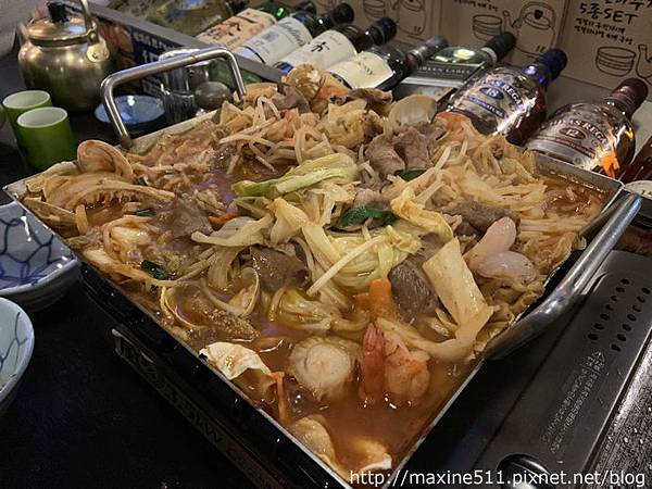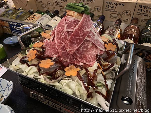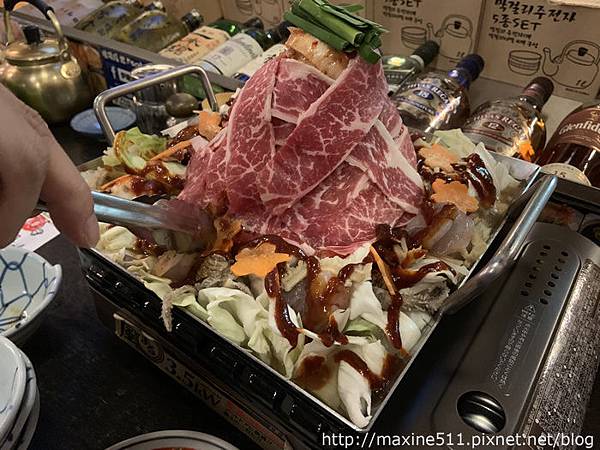 用牛肉片包裹著泡菜,還加了高麗菜、豆芽菜、牛肉、蝦仁、蛤蜊等配料,再加熱的同時慢慢翻煮配料與牛肉,均勻攪拌辣醬。