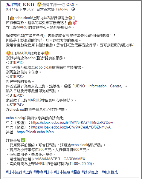 大家到國外玩一定會需要寄放行李的時候,這次到日本也不例外,最後一天要在上野車站附近找行李寄放,網路上有很多詳細的情報,提供置物櫃的位置、開放時間跟價格。不過大家都建議一定要提早去放行李,不然會快就會沒位置。已經做好心理準備要早起去搶置物櫃的時候,在滑手機的時候看到日本丸井百貨的貼文。