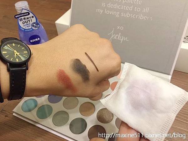 拿到這個眼部卸妝液的時候前陣子請代購買的Morphe Morphe x Jaclyn Hill Eyeshadow Palette也到貨了,剛好可以用這盤超上色的眼影盤來示範卸妝效果。