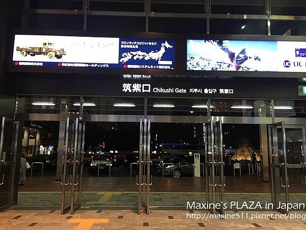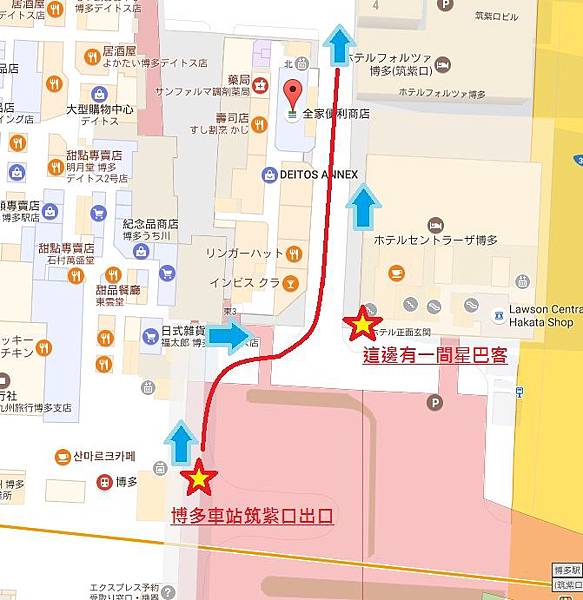 從熊本車站搭車到博多車站,下車後往「筑紫口」標示方向走,走出出口後正前方會是計程車排班處,這個時候要往左手邊看,會看到一間星巴客。在從星巴克的巷子裡面走,這條街前方會看到全家,一直走到巷口。這條巷子還算熱鬧,除了有飯店以外還有一些餐廳。